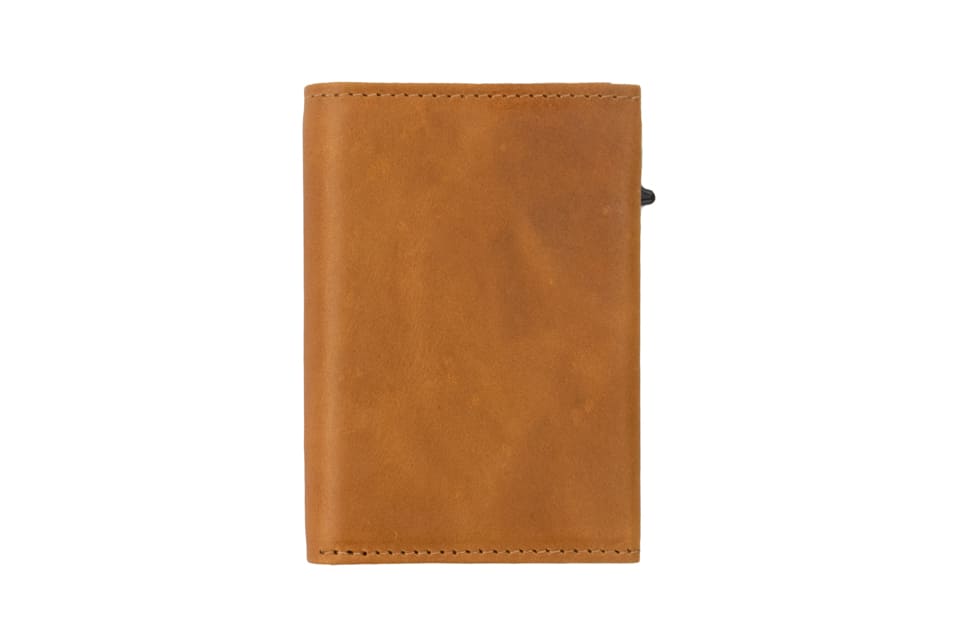 A sleek take on the classic trifold, this RFID-protected wallet stores up to 10 cards, banknotes, and coins—all packed into a compact, pocket-friendly design. Crafted from premium leather with a solid metal core and a quick-access push button for effortless card retrieval.
